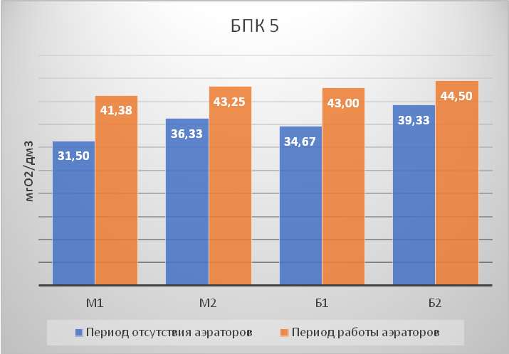 Следующий показатель, который заметно изменился после включения аэраторов, это биохимическое потребление кислорода (БПК5). Характер изменений показан на рисунке 5. На всех точках отмечено увеличение БПК5 в 1,1-1,3 раза. Это не было связано с увеличением содержания взвешенных веществ и мутности воды, так как эти два показателя практически не изменялись после включения и выключения аэраторов. Возможно, что повышение содержания кислорода и ОВП активизировало биохимические процессы, происходящие в водоемах, что и повлекло за собой рост БПК5
