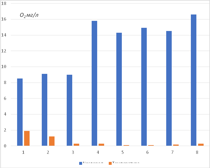 Как видно из рисунка 3, установка аэраторов позволила быстро повысить содержание растворенного кислорода. Влияние температуры воды на этот процесс можно исключить, по крайней мере в течение первых 8и декад экспериментов.
