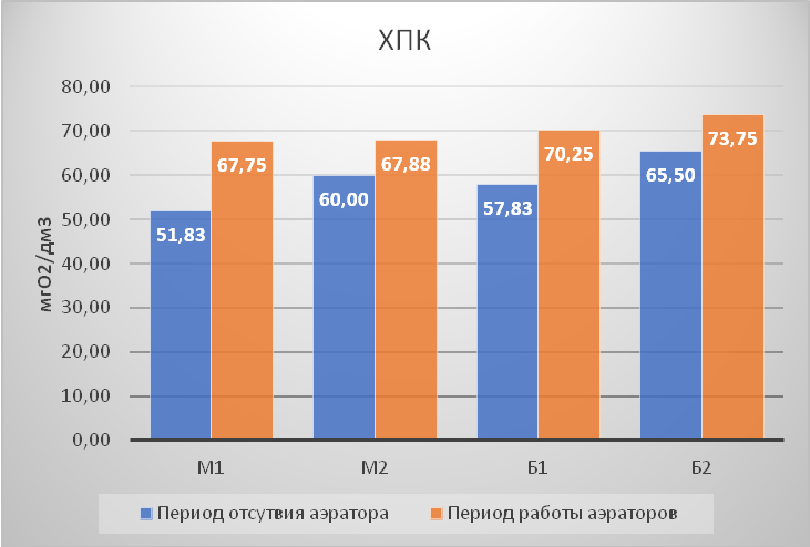 Как и следовало ожидать, сходная картина получилась и при измерении ХПК. В период работы аэраторов этот показатель оказался выше, чем в периоды, когда аэраторы не работали.