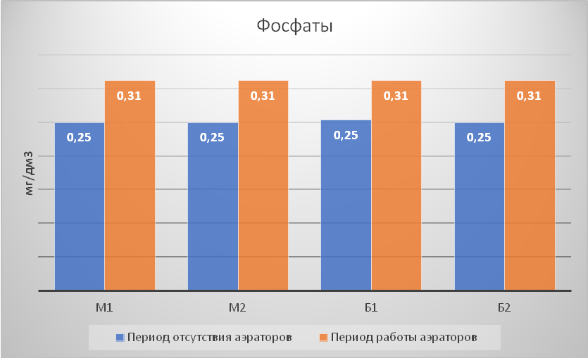 Уровень нитрат-ионов во время работы аэраторов оказался выше почти в 2,5 раза. Содержание фосфат-ионов имело явную тенденцию к росту в то время, когда на прудах были включены аэраторы. Абсолютные значения этого показателя оставались на среднем уровне, характерном для поверхностных эвтрофных водоемов. Фосфат-ионы, как правило, являются основным необходимым для развития фитопланктона биогеном.