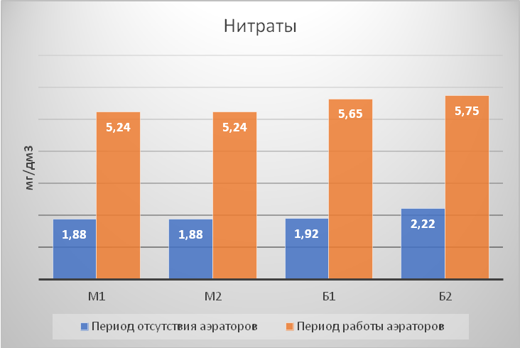 - В результате работы аэраторов активизировались процессы нитрификации, что привело к увеличению в воде конечного продукта – нитратов, наименее токсичного соединения по сравнению с аммонием и нитритами.