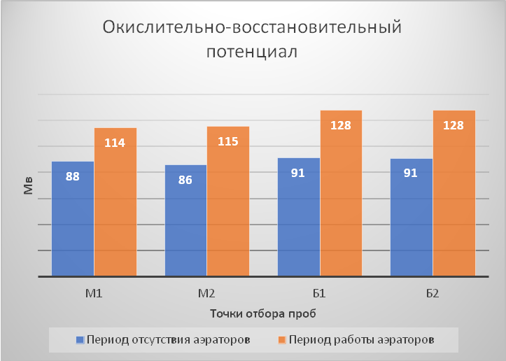 Вполне естественно, что с ростом содержания кислорода в воде существенно возрастал и ОВП, в среднем в 1,3-1,4 раза. Вместе с тем абсолютные значения ОВП хотя и выросли, но оставались сравнительно невысокими, характерными для эвтрофных водоемов.