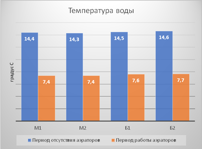 Если анализировать изменения температуры воды в периоды наблюдений, то можно заметить, что в периоды, когда аэраторы не работали, температура была в среднем выше, чем в основной период. Это показано на рисунке 2.