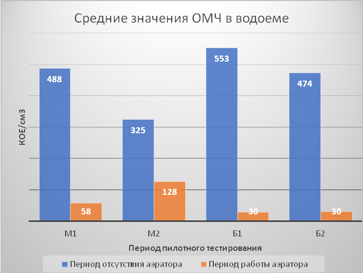 - Под воздействием аэрации радикально снизилось общее микробное число (ОМЧ), что свидетельствует о существенном улучшении санитарного состояния водоема.