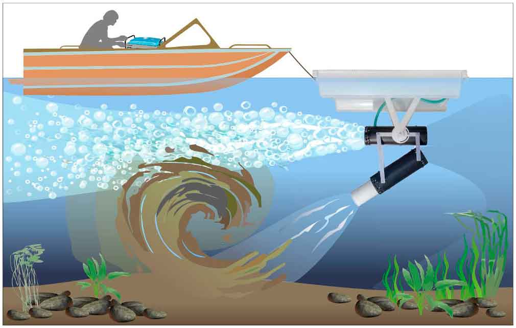Устройство позволяет обрабатывать значительную акваторию, насыщая кислородом всю толщу воды. При этом происходит удобрение прудов без использования химических удобрений за счет биогенов, содержащихся в прудовом иле.